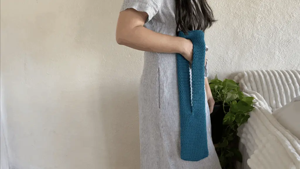 The bag is worked in one piece starting from the bottom and went up until the desired length for cellphone to fit it. Once the pouch part is completed without fasten off continued to crochet the handles, dividing from the middle and continuing to form right and left straps. When the handles are completed, you connect the pieces and continued in the round and fasten off after 7 rounds. That’s it. Done with the bag. Detailed instructions are below.