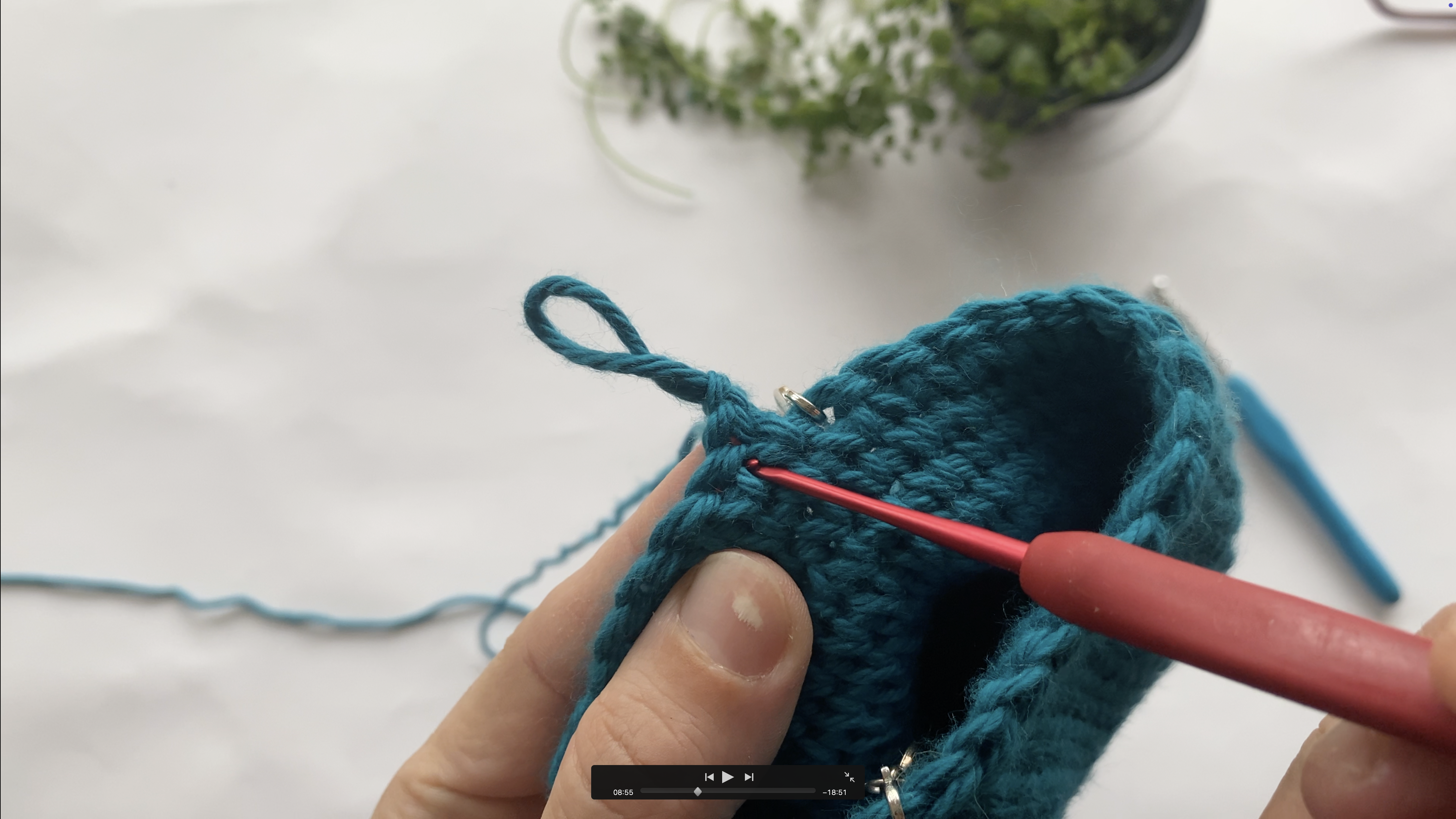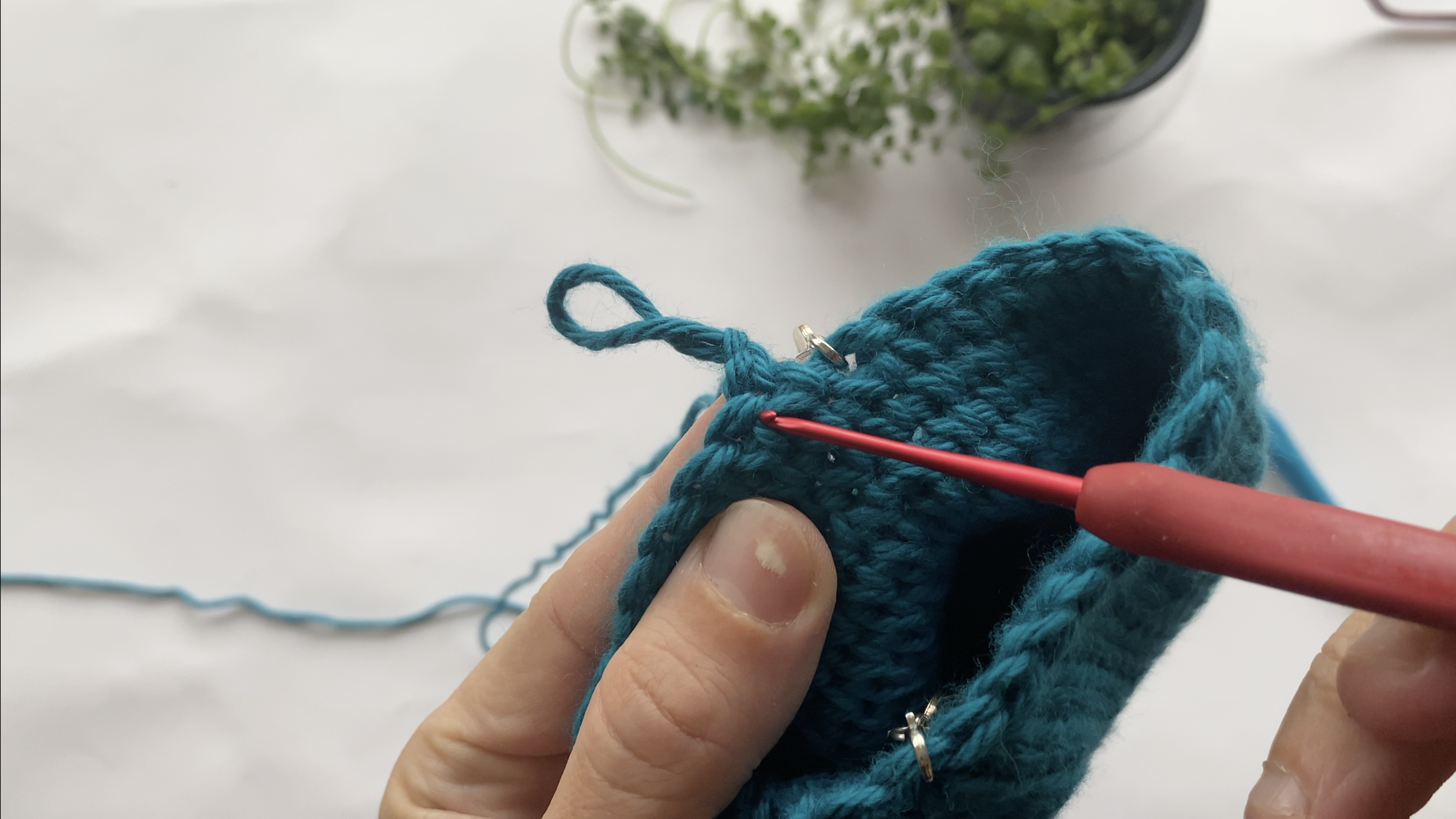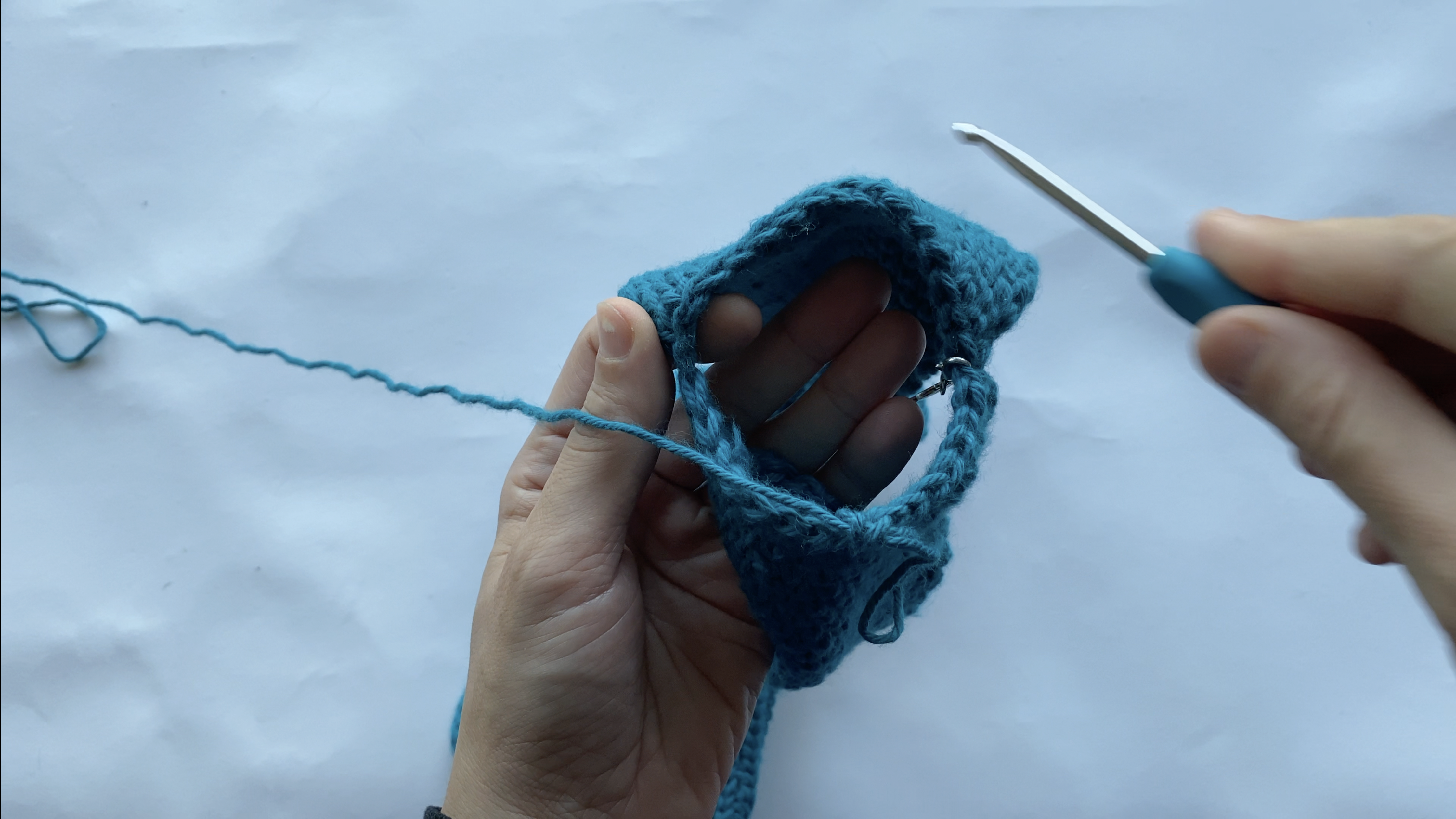 At the end of row 49, continue with 1 waistcoat st to each, attaching the other handle, make sure to place a sm so you know where the beginning st is. You should have total of 32 sts.