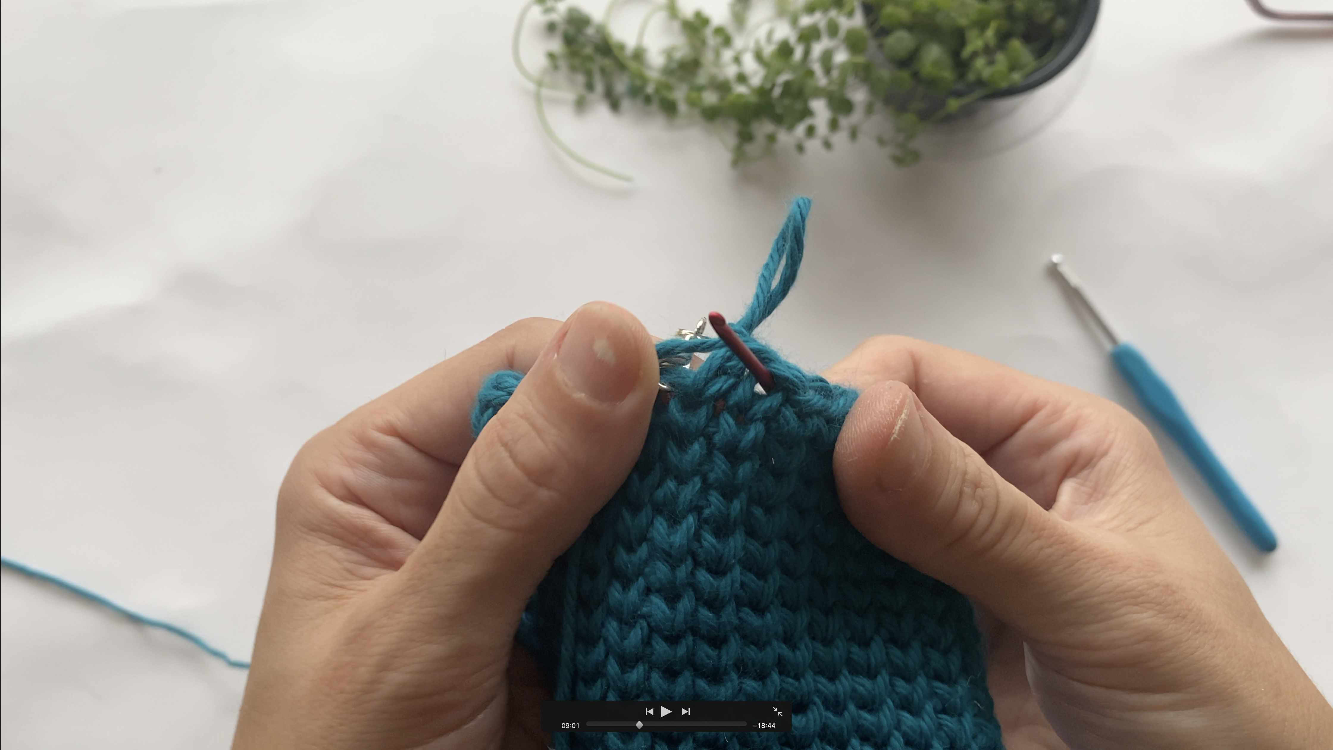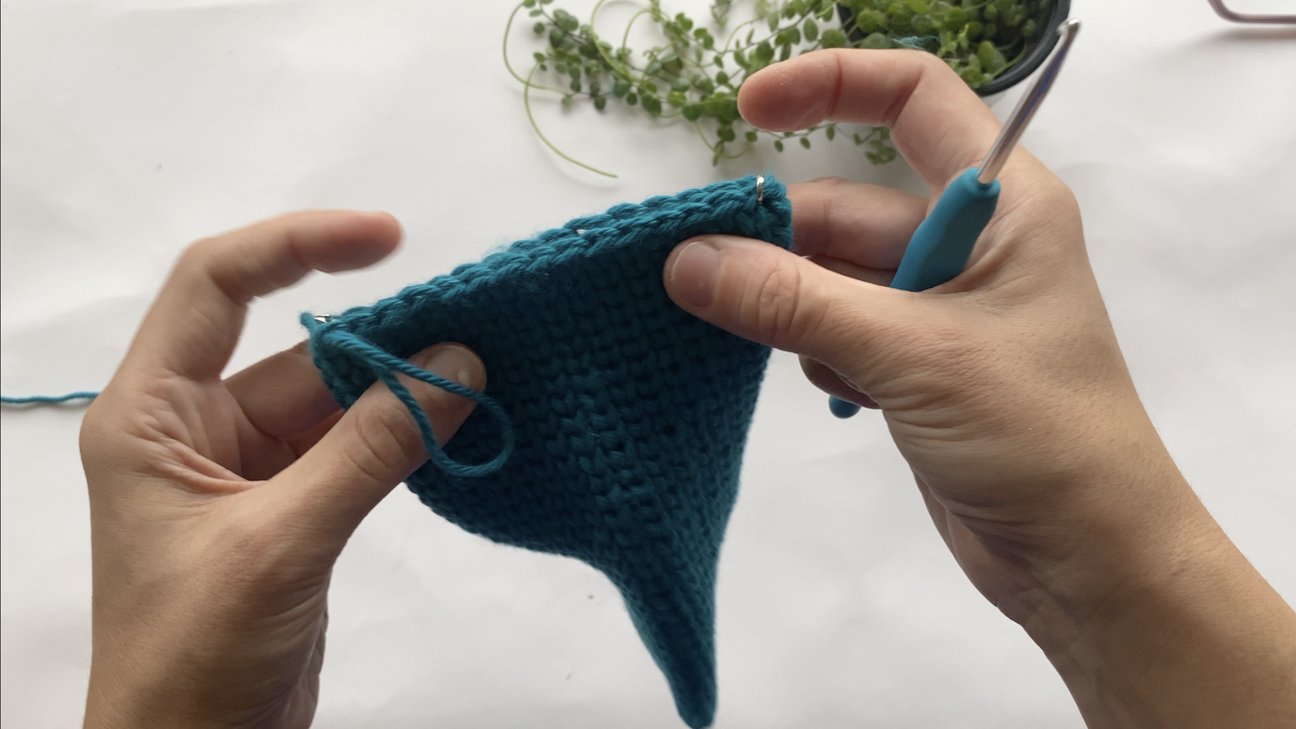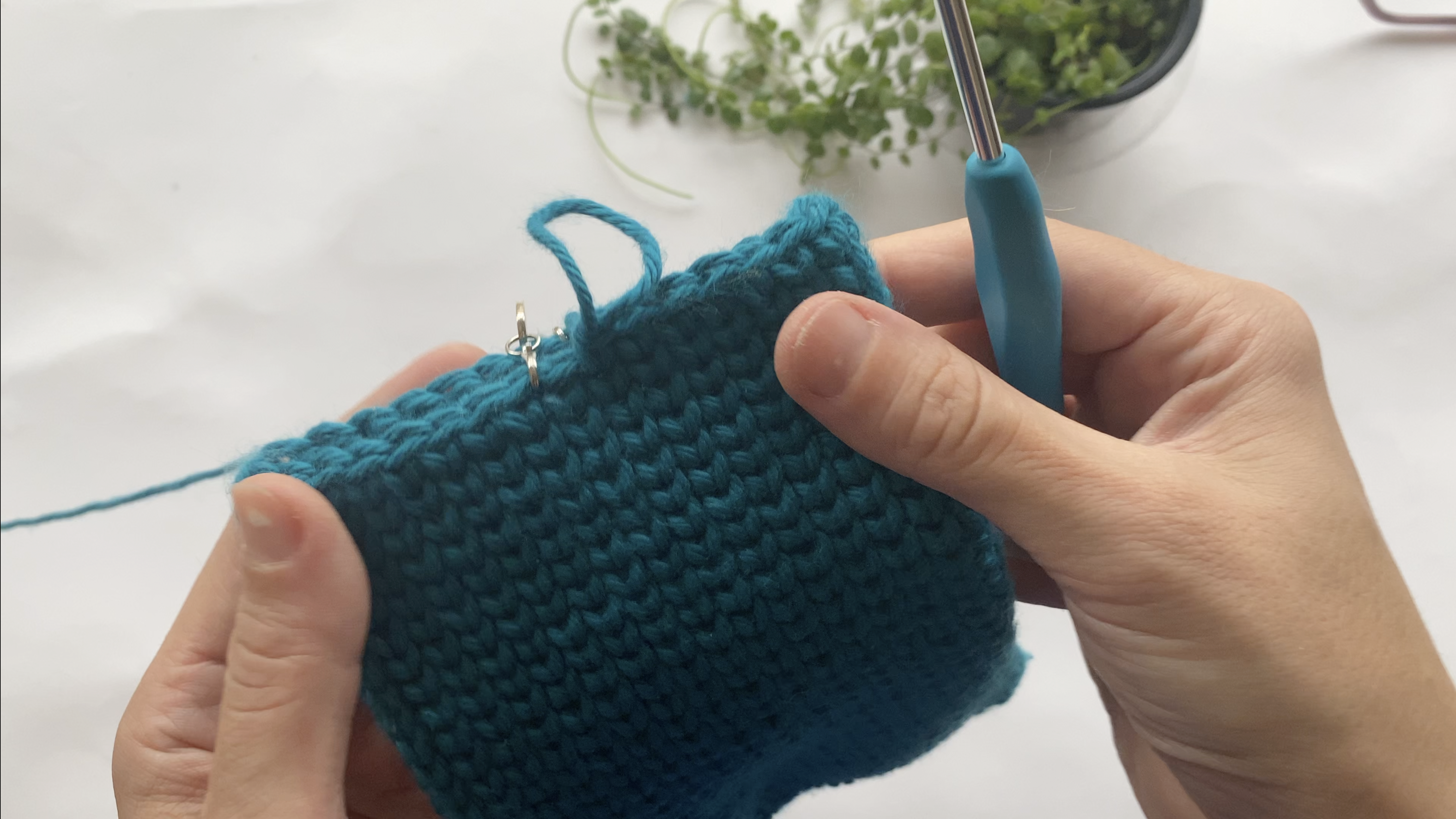 At the end of row 49, continue with 1 waistcoat st to each, attaching the other handle, make sure to place a sm so you know where the beginning st is. You should have total of 32 sts.