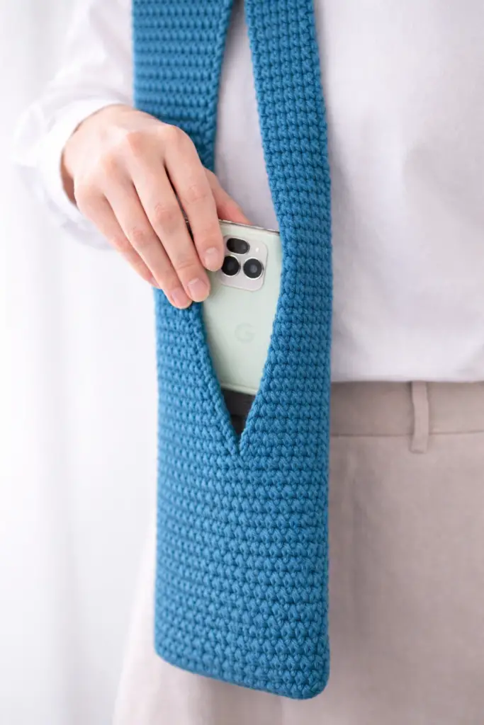 The bag is worked in one piece starting from the bottom and went up until the desired length for cellphone to fit it. Once the pouch part is completed without fasten off continued to crochet the handles, dividing from the middle and continuing to form right and left straps. When the handles are completed, you connect the pieces and continued in the round and fasten off after 7 rounds. That’s it. Done with the bag. Detailed instructions are below.