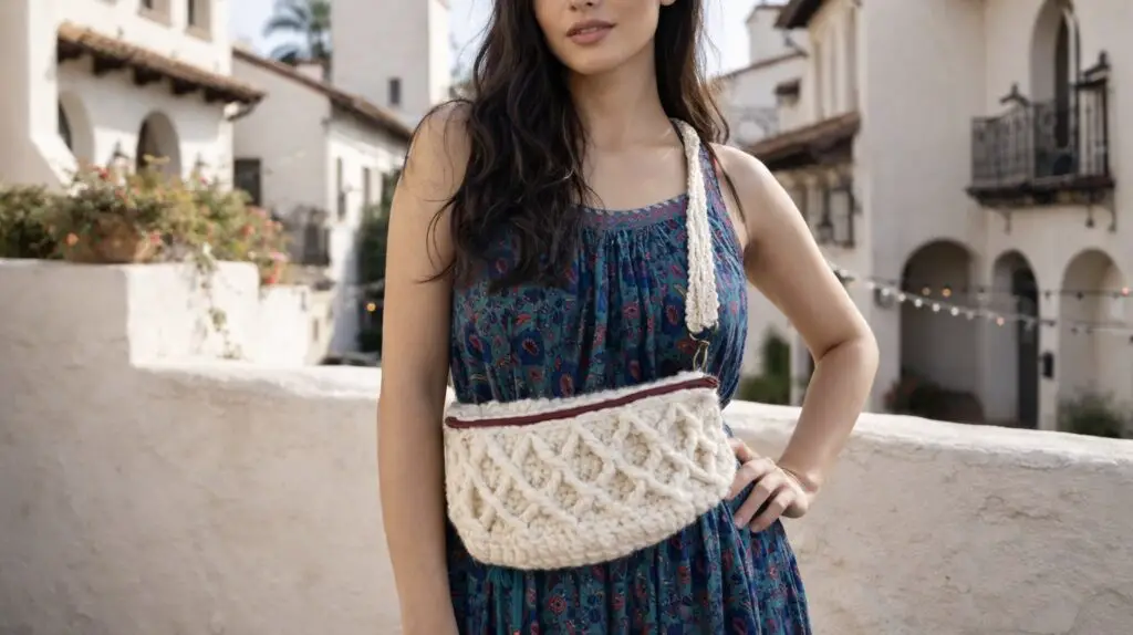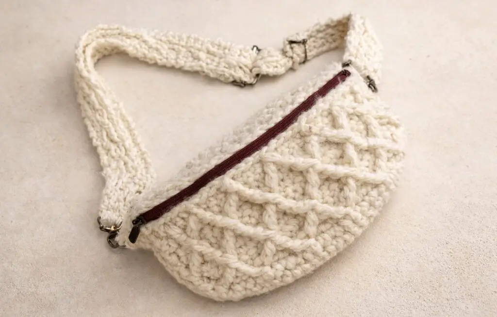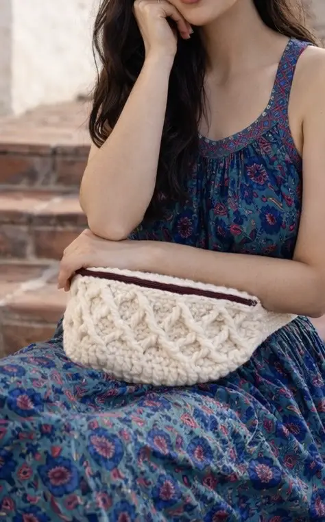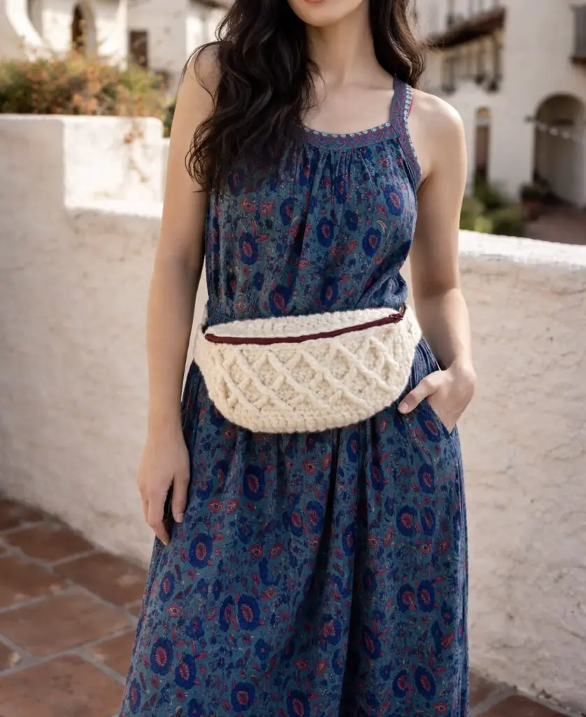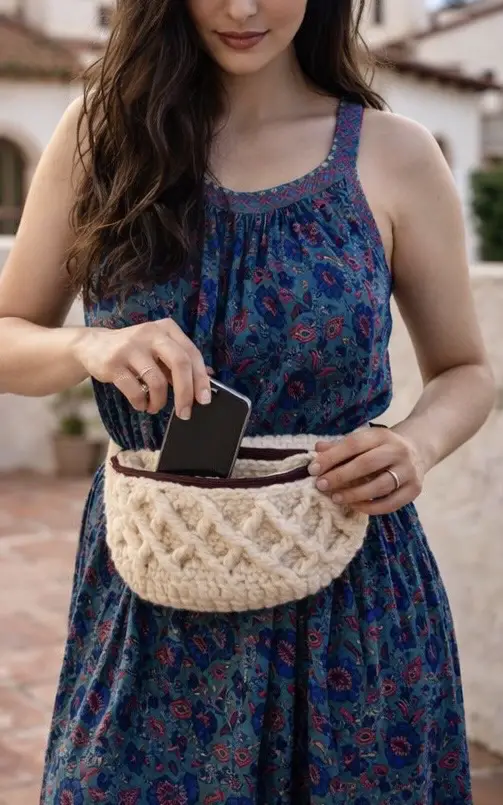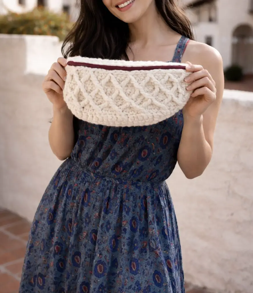 This crochet fanny pack is very lightweight and extremely soft. It’s made with only one skein of bulky yarn. You can wear as a fanny pack or shoulder cross bag. It’s a very versatile bag.
