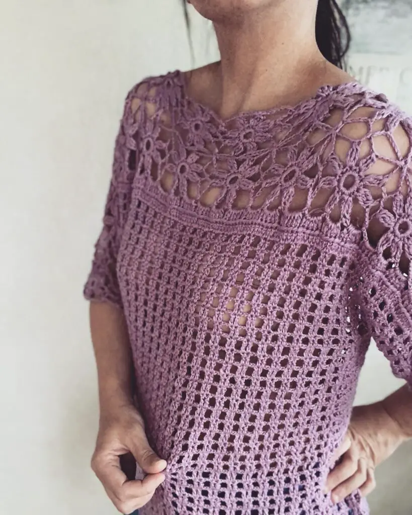I made this crochet top and got a lot of compliments, and a lot of people asked about different sizes. This top is made only in one piece and there is no neckline shaping or armhole shaping, so it’s very easy to accommodate to a different size. I would recommend using one of your favorite tops when making/counting the foundation chains to start, and make sure that your stitch count is multiples of 16. I have a detailed written instruction below. I have also attached the video tutorial below.