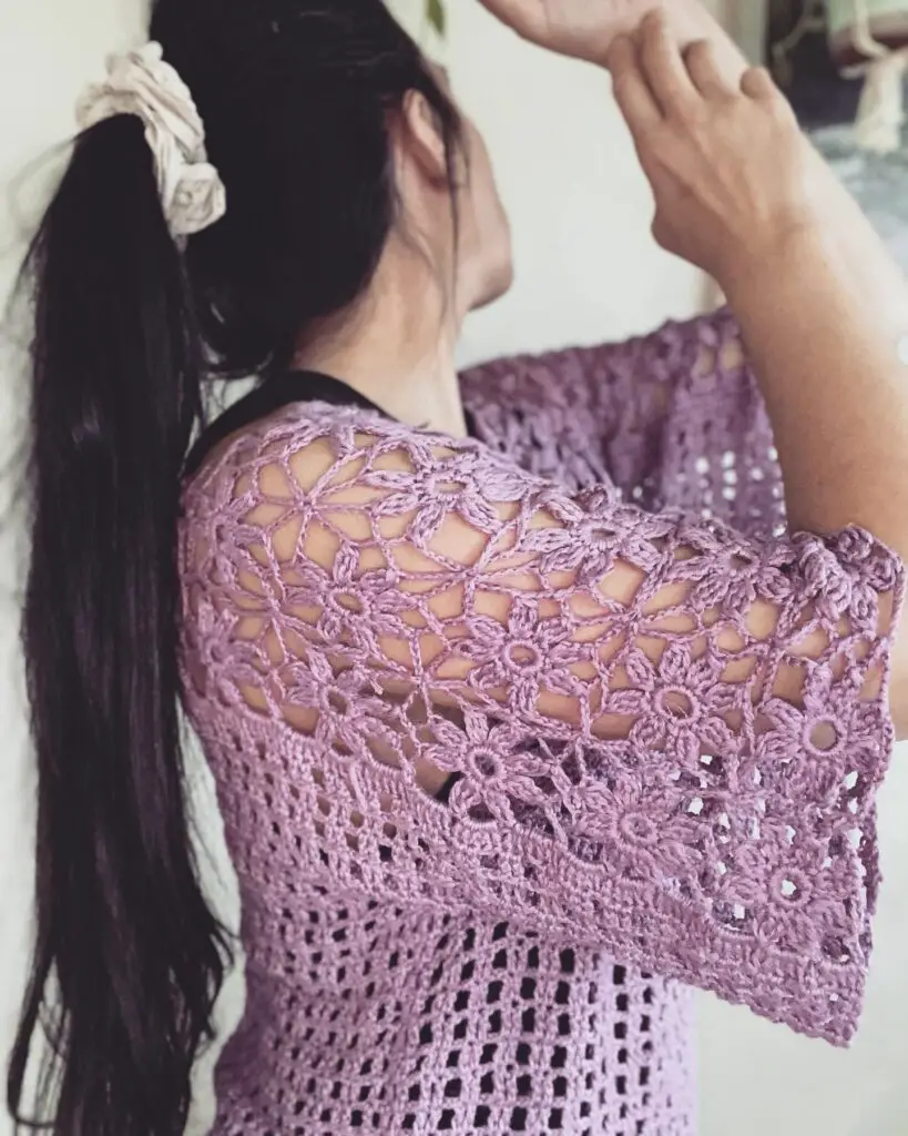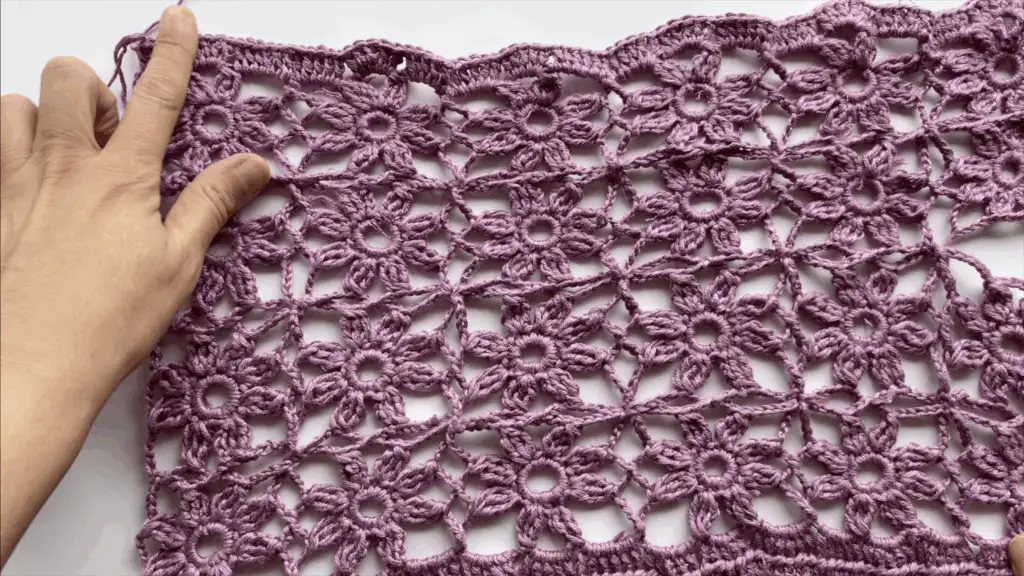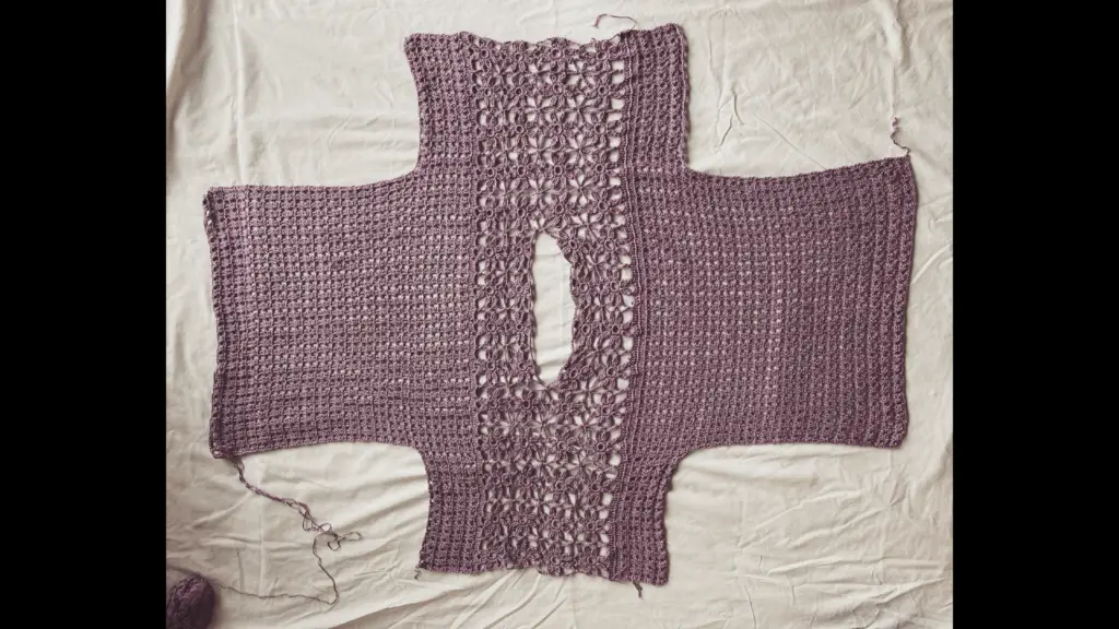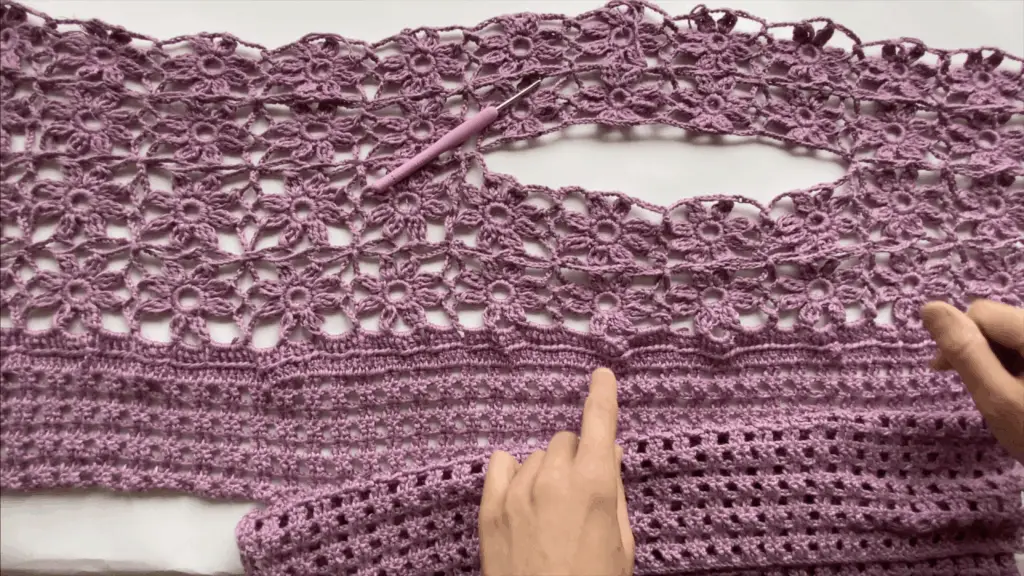 Row 1 of back body piece and sleeves: 5 edc to each space and 1 edc to st between the flowers (connecting st of 2 flowers). Continue with 5 edc to each space. 1 edc to st between the flowers. Total st count is 224. At the end, after crocheting 5 edc into the last space, make 1 more edc to the ch st at the end, ch 3 and turn.