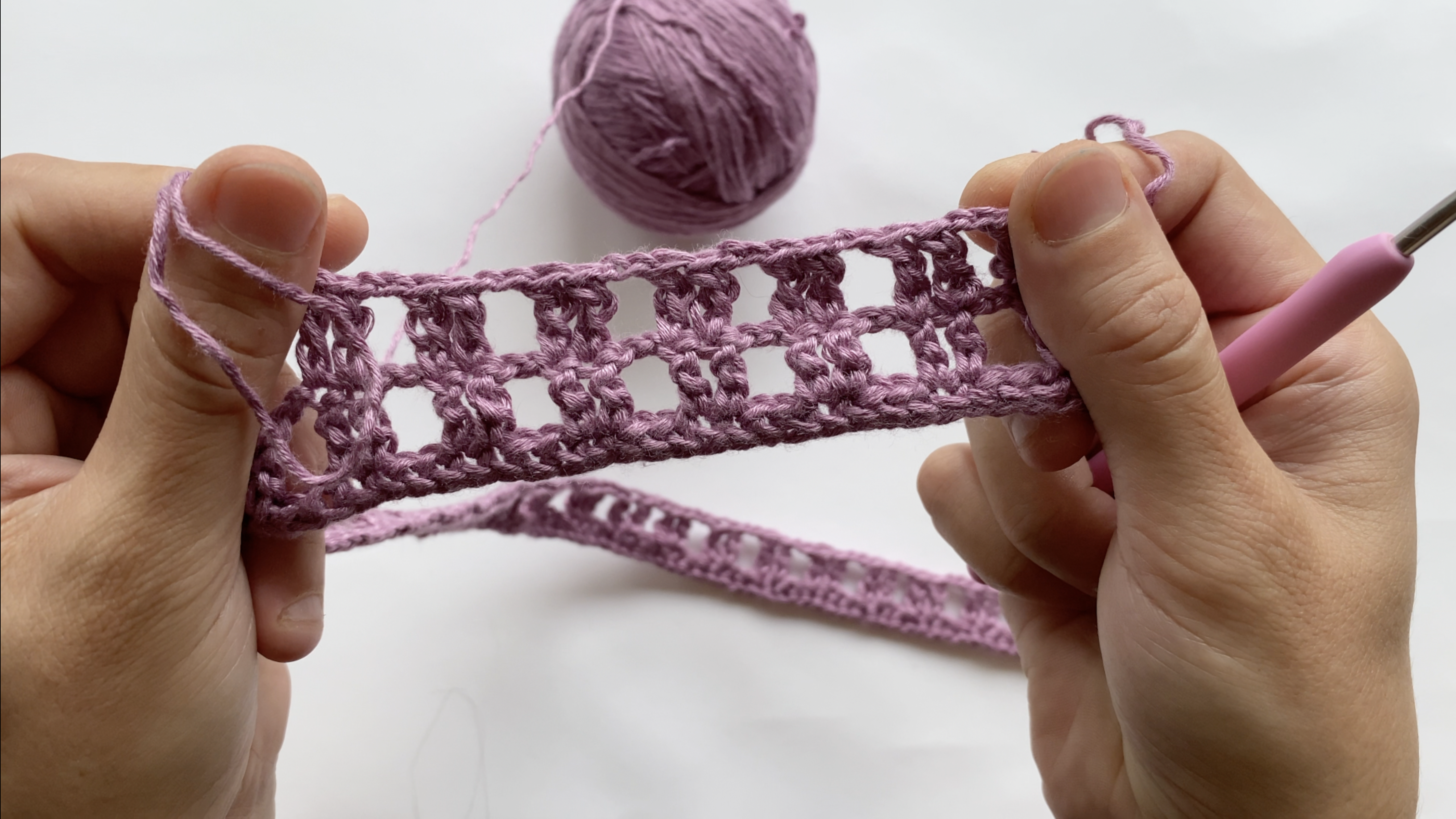 Row 2 -29: 1 edc to next st. (ch 3 counts as 1 edc). *Ch 2, sk the space, make 1 edc to next 2 sts. Rep from * until the end of the row. Ch 3 and turn your work.