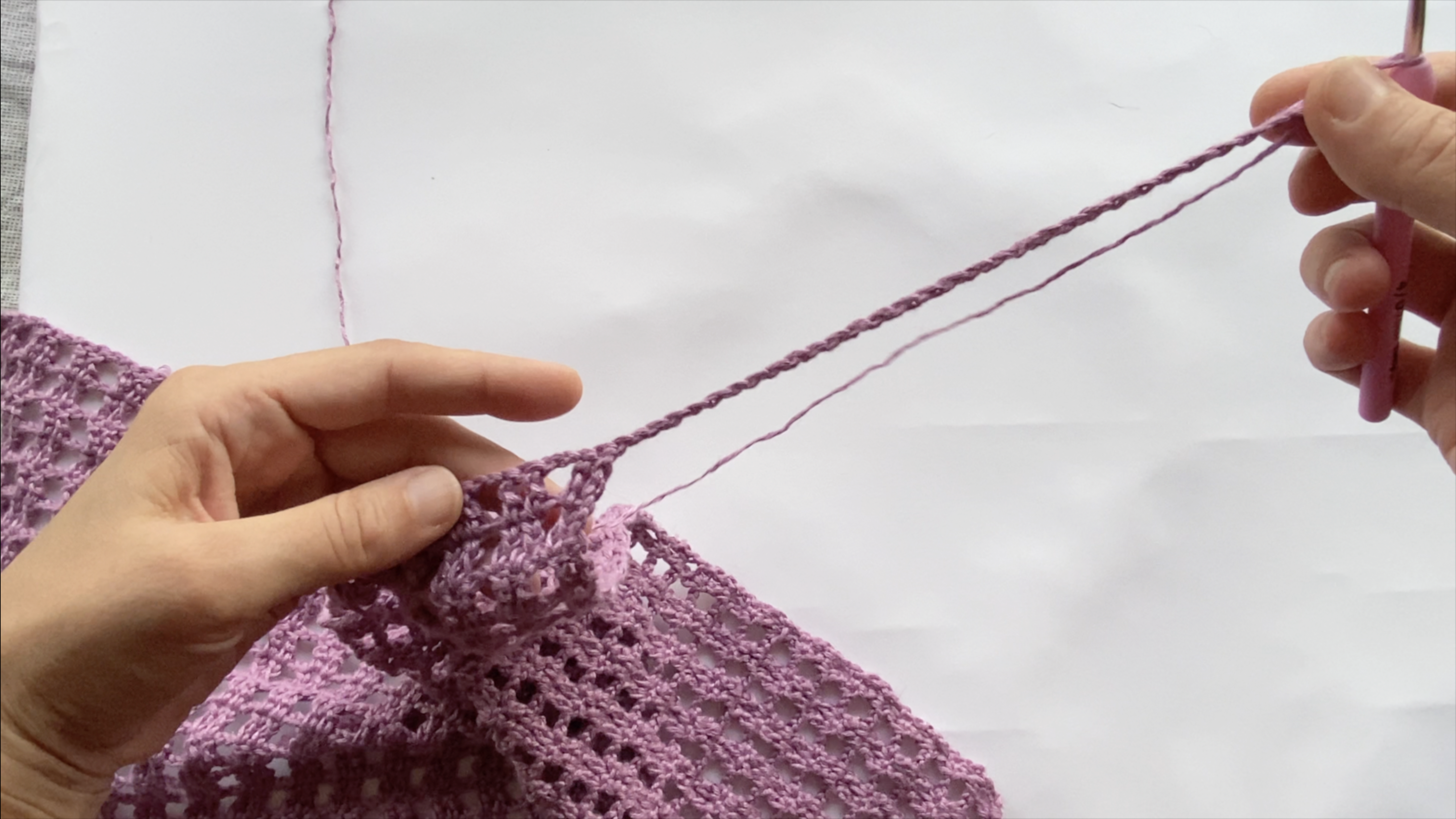 Row 1 of front body part: *Ch 2, sk 2 sts, 1 esc to next 2 sts. Rep from * until the end of the row. Ch 3 and turn your work.
