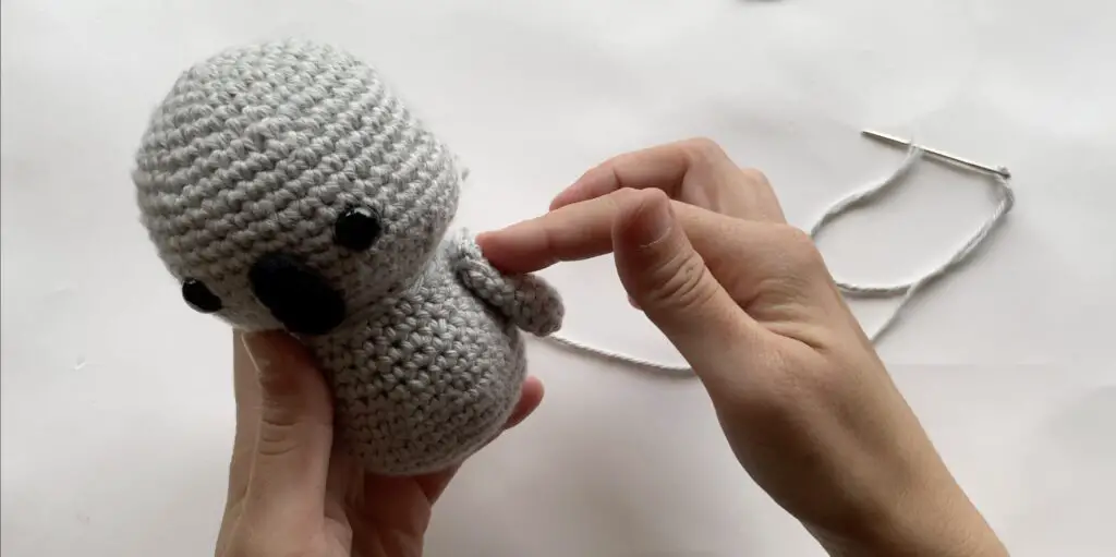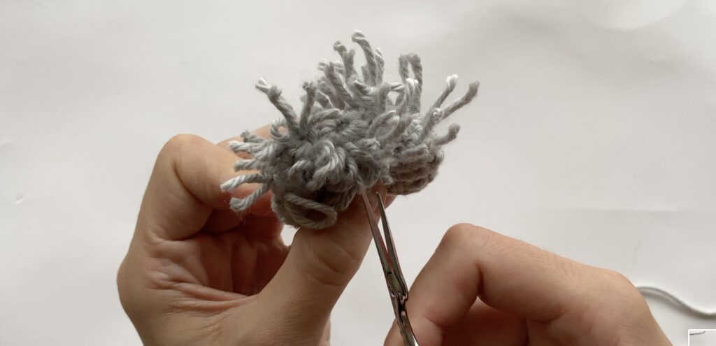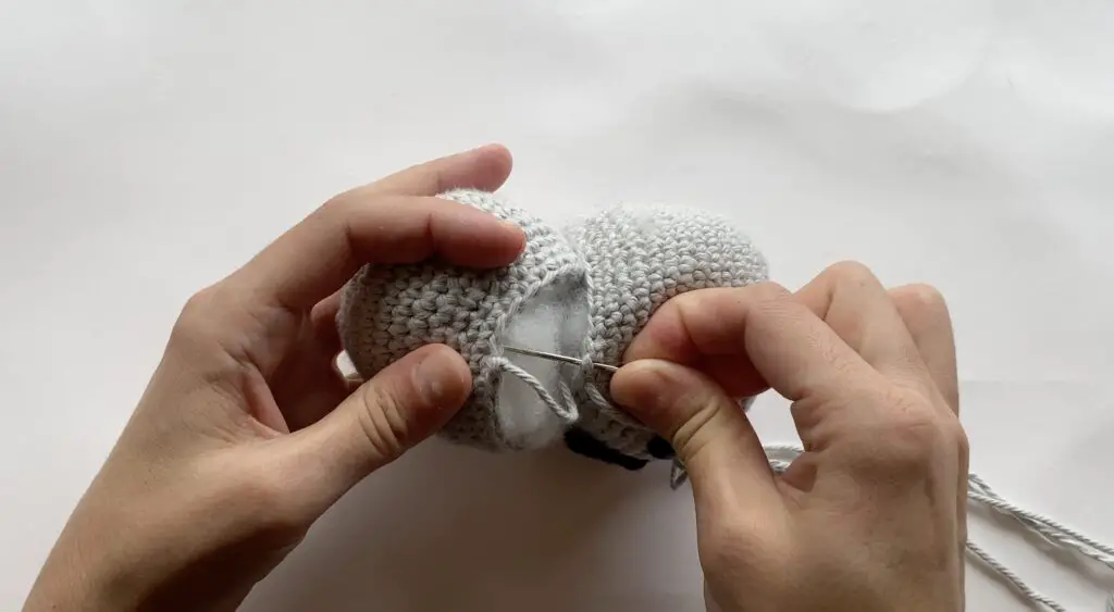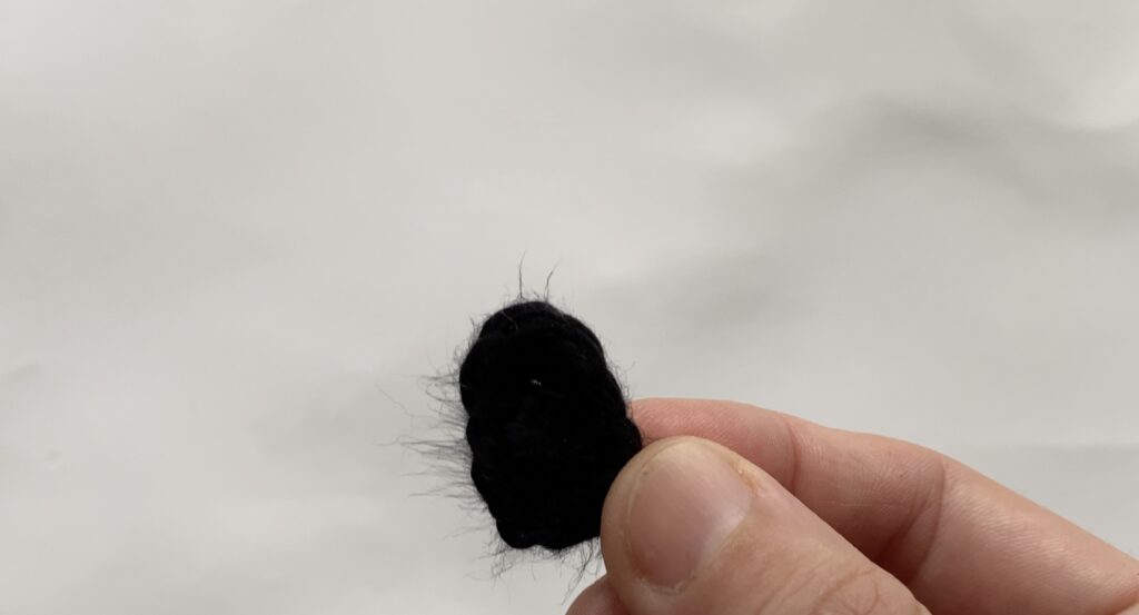 Slip stitch to close the yarn, chain 1, fasten off. (when you fasten off, make sure to leave long tail to sew this piece to the head piece later on.