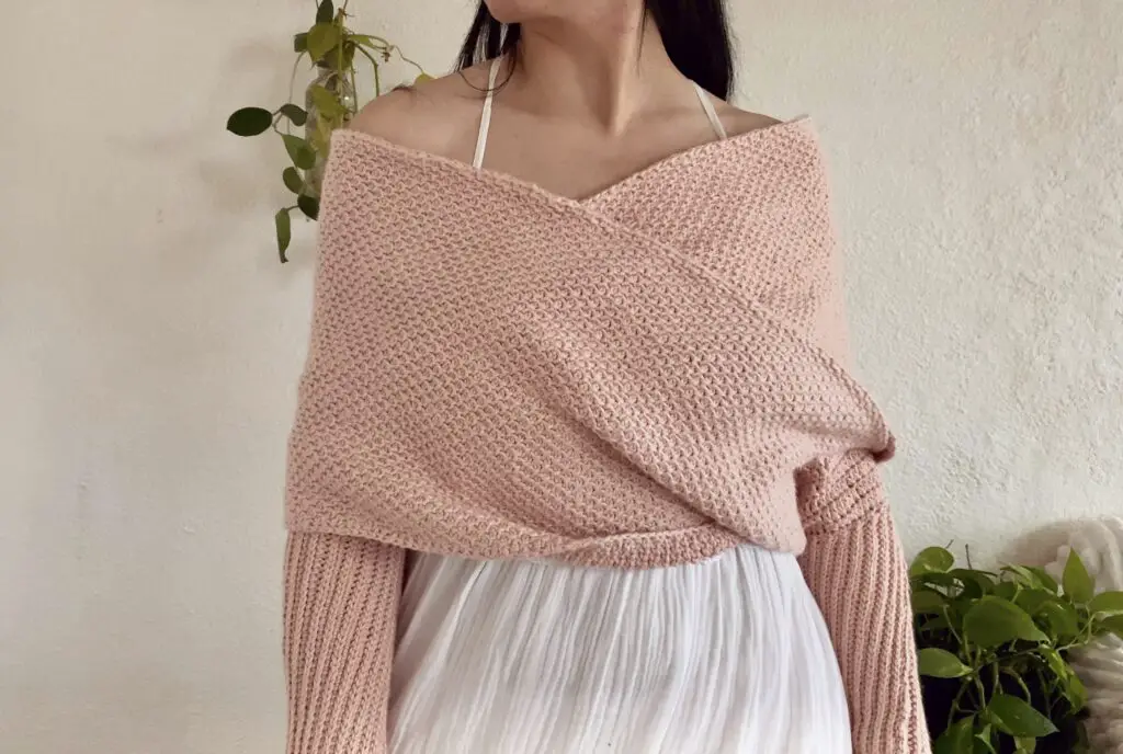 TIP: To make your own size, measure your bust and multiple by 1.8. That’s the size you need to make the rectangle piece. You need to also calculate with the gauge provided above to find how many sts and rows you need to crochet.
